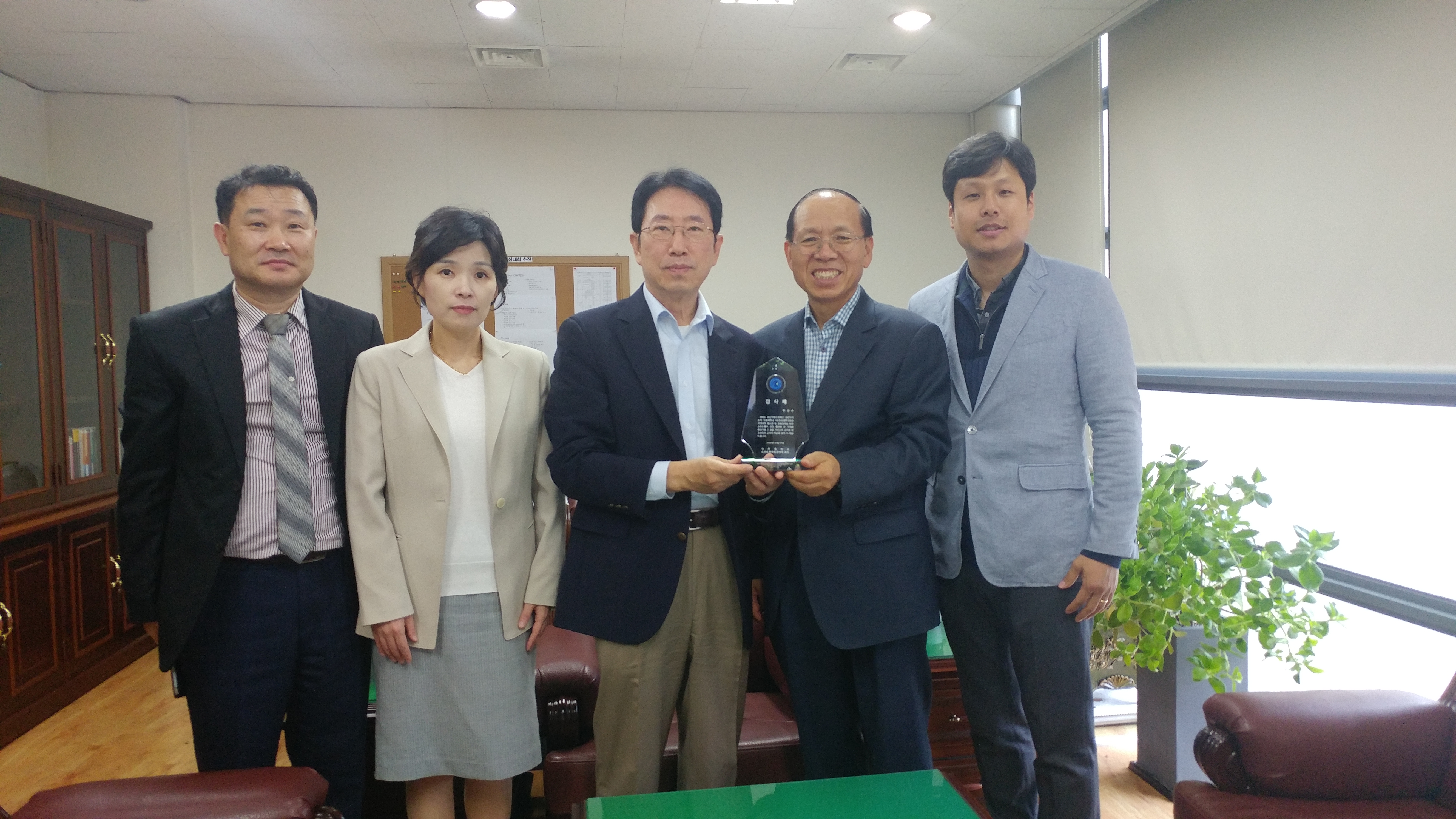 <사진 : 가천대 소프트웨어중심대학사업단 김원 단장이 한신수 대표에게 감사패를 전달하고 있다.>