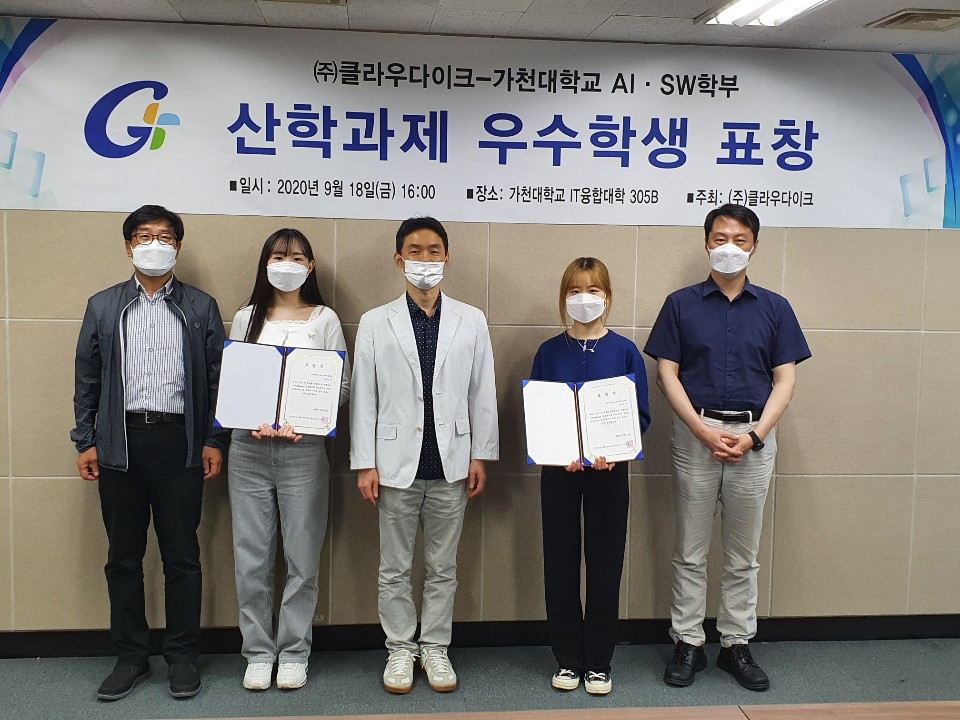 가천대 AI.소프트웨어학부 김진아, 유은석 학생이 (주)클라우다이크로부터 산학과제 수행으로 회사의 신규 서비스 개발에 기여한 성과를 인정받아 표창장을 받았다. 이날 수여식에는 김원 특임(AI)부총장, 이선웅 (주)클라우다이크 대표 등이 참석했다. 학생들은 올해 7~8월에 (주)클라우다이크에서 산학과제를 수행하면서 회사의 신규 서비스의 프로타입 앱 소프트웨어를 개발하였으며, 회사에서는 학생들의 결과물을 바탕으로 연말에 실제 상용화를 할 계획이다.
