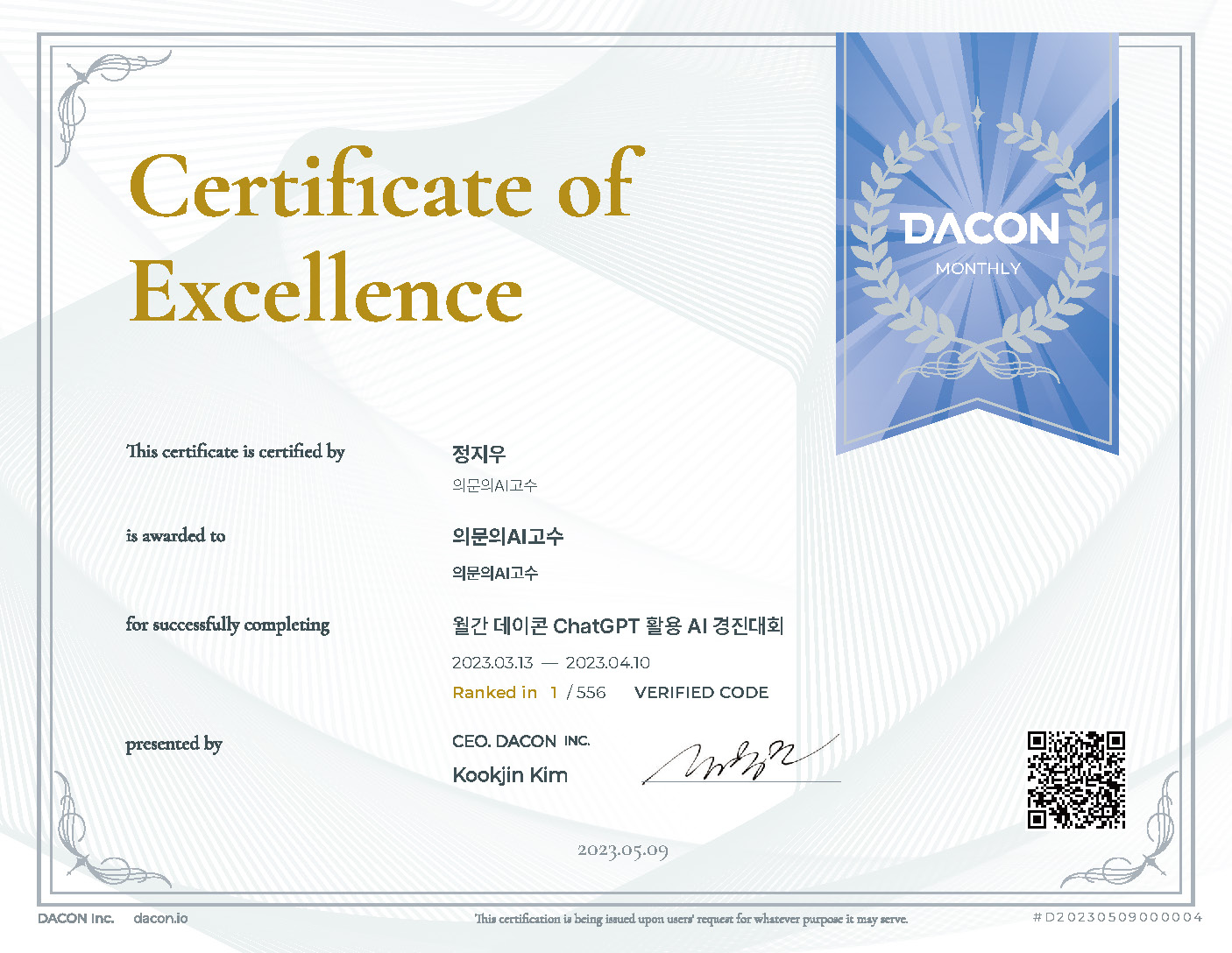 AI.소프트웨어학부 4학년 정지우 학생이 월간 데이콘(DACON) ChatGPT 활용 AI 경진대회에서 최종순위 1등으로 우승을 차지했다.