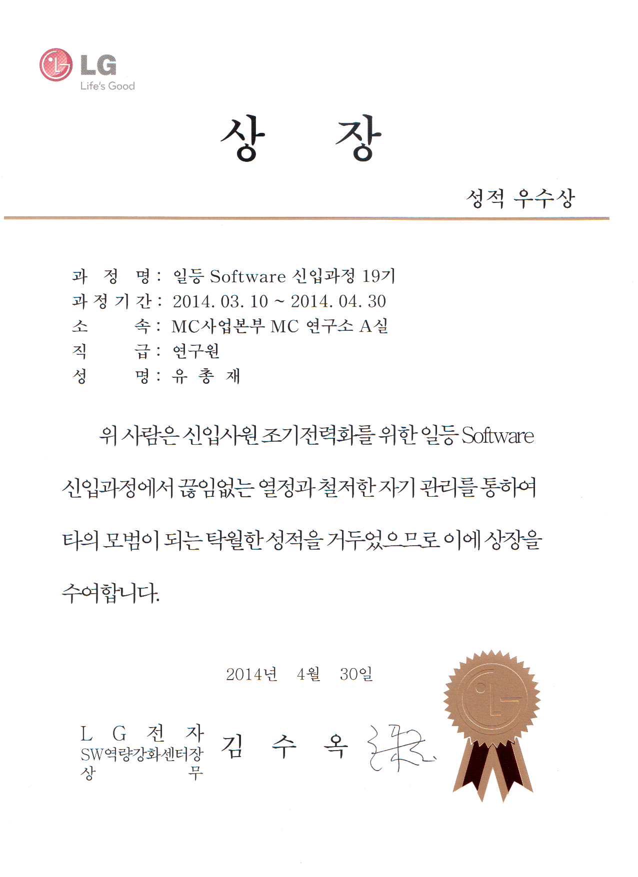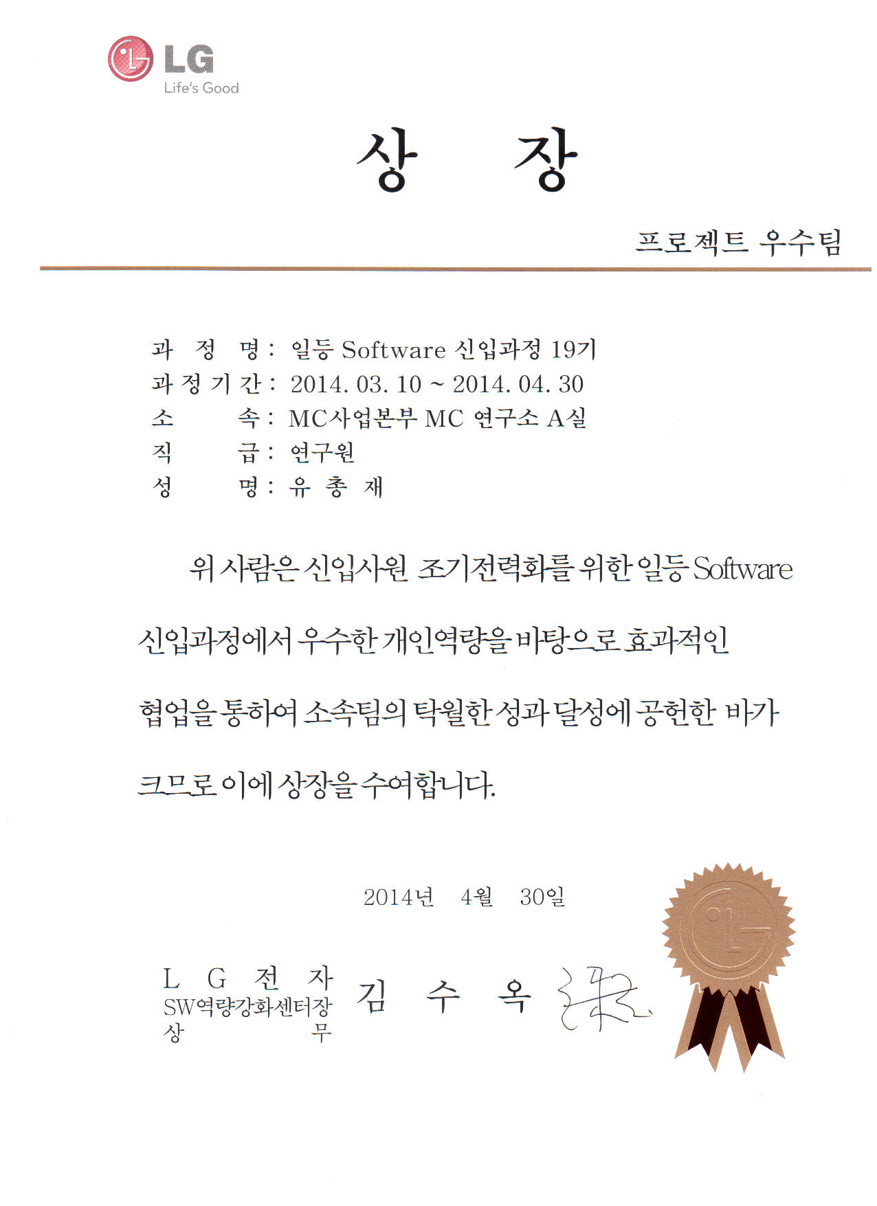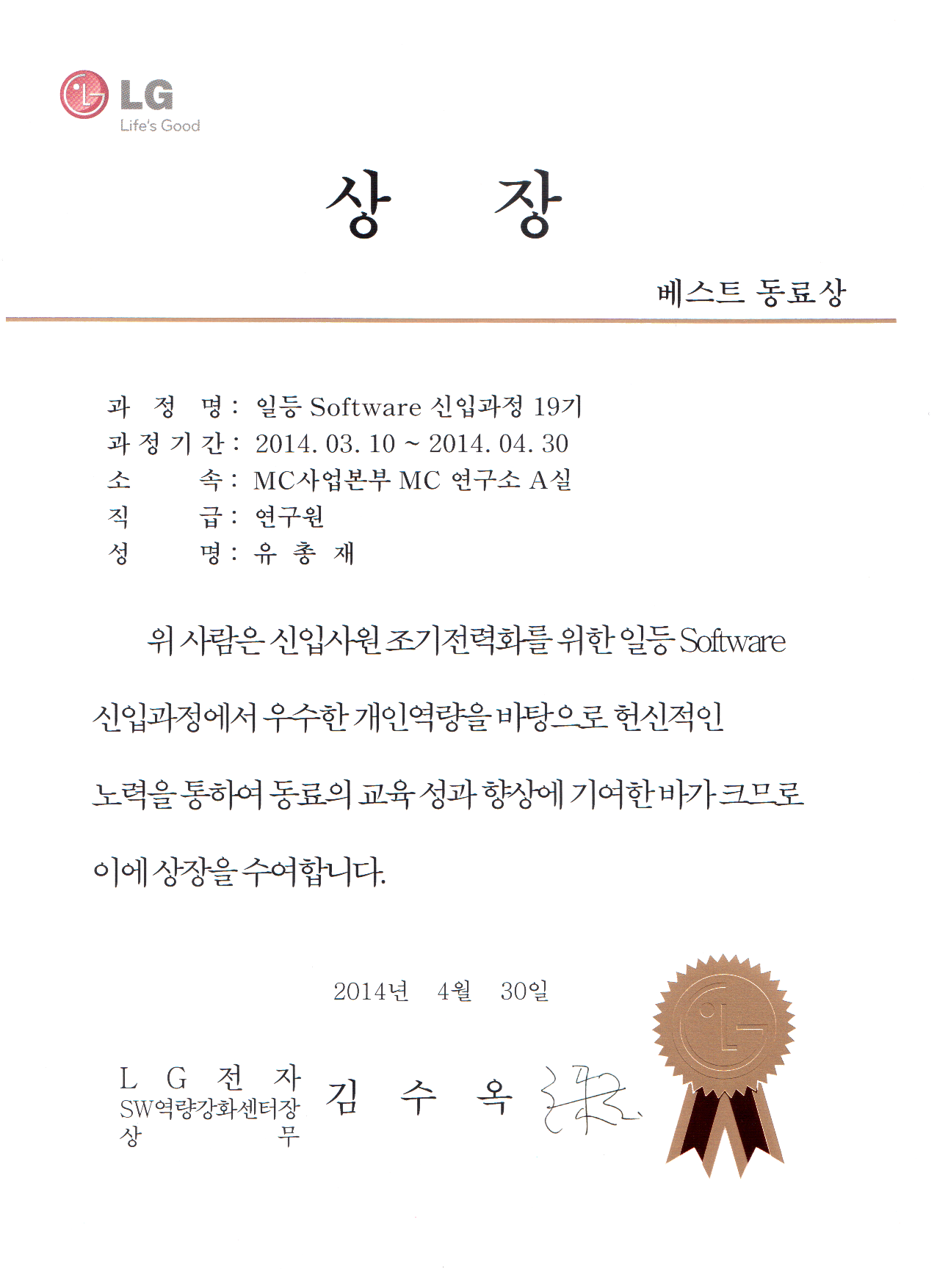 1기 졸업생 유총재가 LG전자 신입사원 연수 과정에서 주어지는 총 4개의 상 중 성적우수상, 프로젝트 우수팀상, 베스트 동료상의 3개 부문 상을 수상하여 우리 학과의 우수한 교육과정을 널리 알렸습니다.