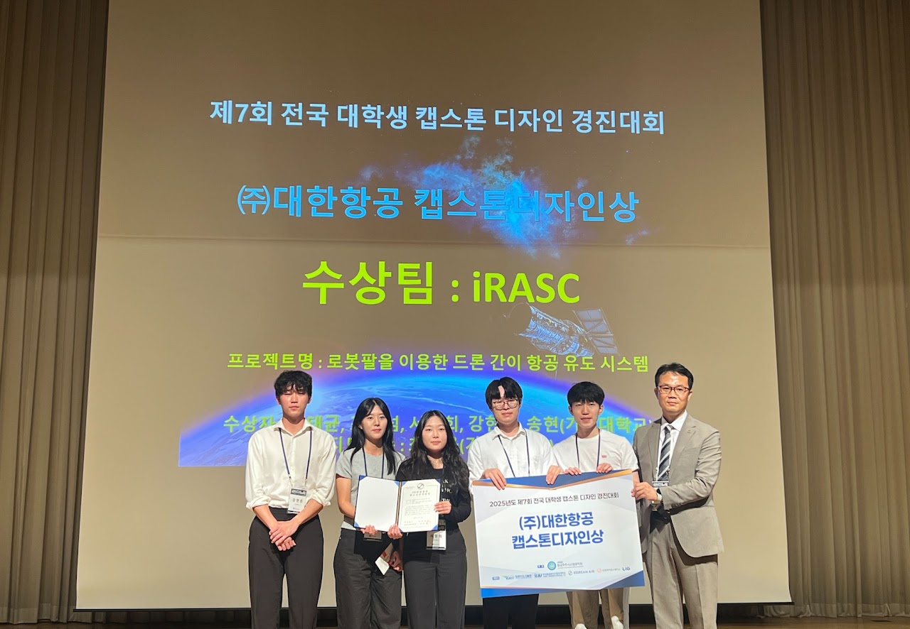 가천대학교 인공지능학과 지능형 로봇 및 자율 주행 시스템 제어 연구실(지도교수: 최재용)의 오태균, 서정희, 표은섬, 강현준, 송현 학생이 지난 18일 제주 휘닉스 아일랜드에서 개최된 ‘제7회 전국 대학생 캡스톤 디자인 경진대회’에서 ‘대한항공 캡스톤디자인상’을 수상했다.이 대회는 항공우주시스템공학회가 주최하고, 항공안전기술원, ㈜한국항공우주산업, ㈜대한항공, ㈜LIG넥스원, ㈜한화에어로스페이스의 후원으로 진행됐으며, 대학생들의 항공우주 관련 분야 실무 적응을 돕고 문제 해결 능력 향상과 창의적 미래 인재 양성을 위해 매년 열린다.